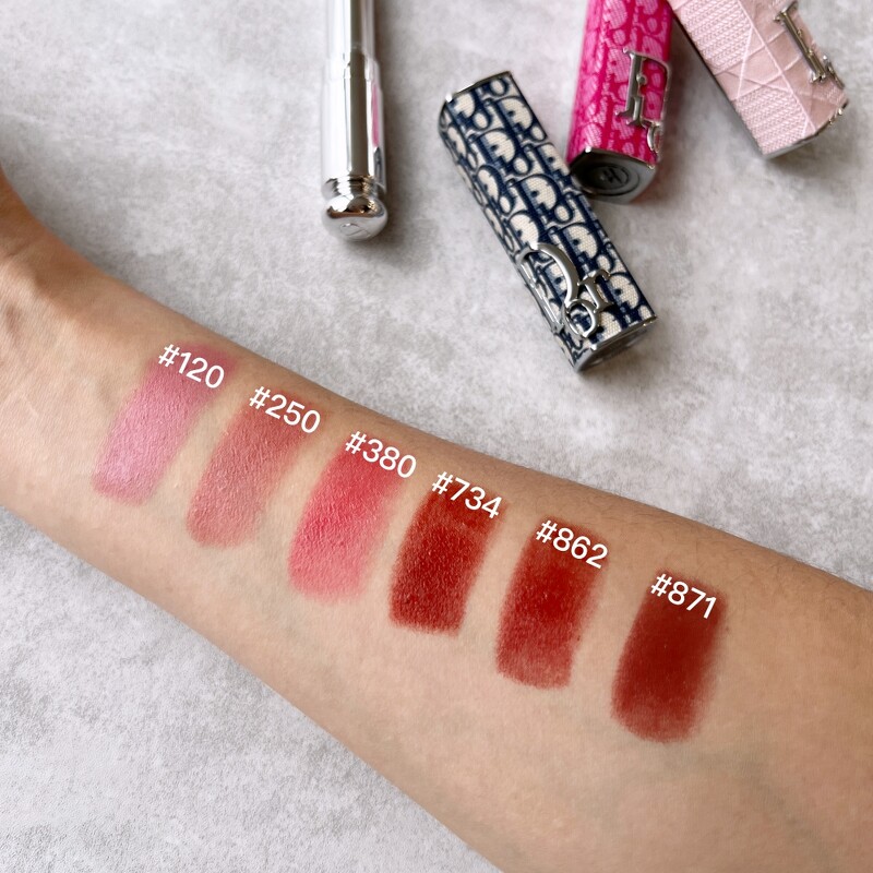 迪奥瘾诱唇膏2025年新色#120、#250、#380、#734、#862、#871手部试色。 其余6色为:#120白桃玫瑰、#250蜜桃裸粉、#380粉漾玫瑰、#734焦糖棕红、#862琥珀红茶、#871乌木冷棕。
