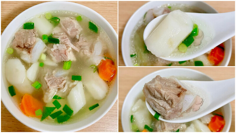 01. 红白萝蔔切块,排骨汆烫去浮沫。02. 将排骨与姜片一起煮约40分钟,加入萝蔔继续煮20分钟,加盐调味,也可以再撒些葱花点缀。