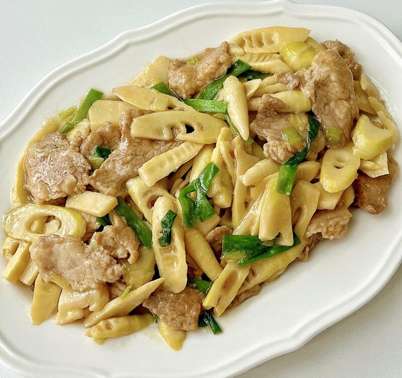 01. 春笋去壳切丝,汆烫去涩味。02. 肉丝用酱油、料酒腌製。03. 先炒肉丝至变色,再加入春笋翻炒,加盐、少许糖调味即可。